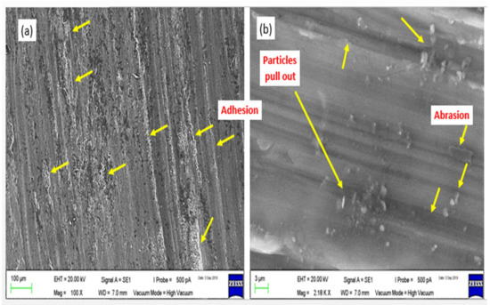 SEM micrographs of the wear tracks of AA7075-T651 base alloy: (a) magnification 100× and (b) magnification 2180×.