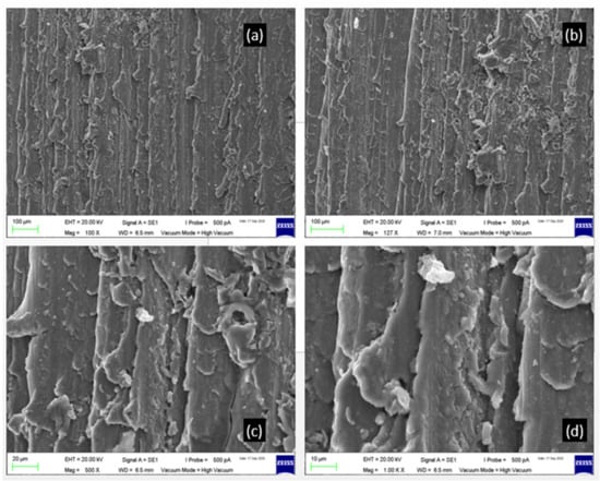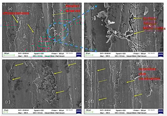 SEM micrographs of the wear tracks of AA7075-SiC/Gr S-10 composite with (a) magnification 100× and (b) magnification 500× (c) 100× and (d) 100×.