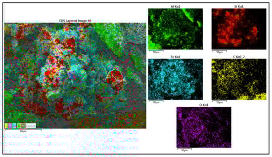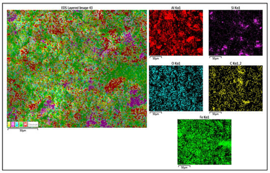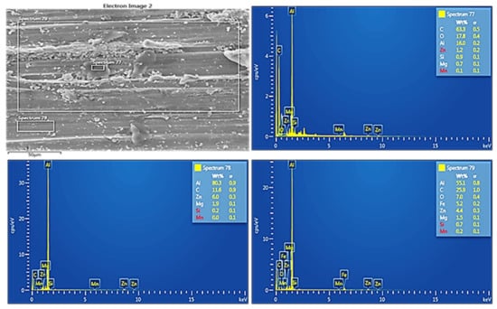 As illustrated in Figure 16, the somewhat dark uniform region supports the existence of a thin graphitic tribofilm since the spectrum78 reveals the presence of C close to the aluminum alloy. The spectrum79, which finally covered the whole track surface within its view, confirmed the presence of SiC/Gr reinforcement and small amounts of steel disc particles as ferrous (Fe) elements. The SiC particles and Graphite flakes forming the mechanically mixed layer over the run S-10 sample surface have been confirmed through the SEM mapping analysis as shown in Figure 17. The dark black colored flakes of graphite have covered the large surface area on the wear tracks. These spread graphite layers act as a solid lubricating medium that subsequently reduces the mating surfaces’ wear rate.