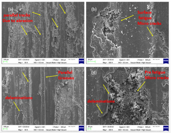 Wear tracks on the run S-24 surface composite indicates (a) parallel tracks due to abrasion (50× magnification) (b) surface fatigue micro cracks (500× magnification) (c) delamination (50× magnification) (d) pre-fatigue zones (200× magnification).