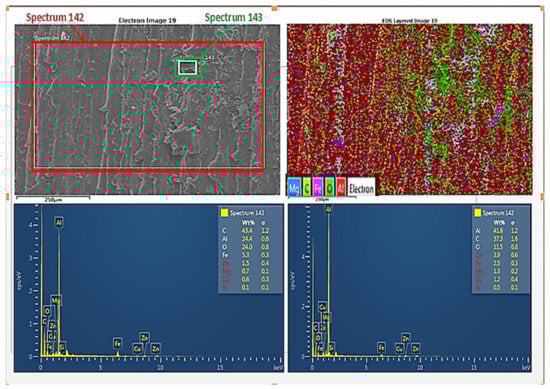 The experimental validation test, i.e., confirmation test sample, processed with parameters of tool rotation-1250 rpm, tool traverse-40 mm/min, hybrid ratio-90:10 and vol. percent.-12 have been tested for wear analysis. The wear tracks have been observed as shown in Figure 19 and were also analyzed through EDX and mapping. The elemental analysis results are shown in Figure 20. In this sample, the abrasive wear tracks are clearly visible with some delamination sites. The adhesive wear look thoroughly absent. The fatigue and fretting wear indications are also not present as shown in Figure 19a–d micrographs. Thus, it can be concluded that the encapsulation of graphitized SiC reinforcement has successfully overcome the fretting fatigue behavior. The SiC particles have acted as the load-bearing elements. They are supported with the graphite tribolayers, making the surface-to-surface contact smooth, thus avoiding any further exploitations of the dendritic α-phase base aluminum alloy. The SiC particles and graphite flakes entrapped can be observed over the surface of wear tracks.