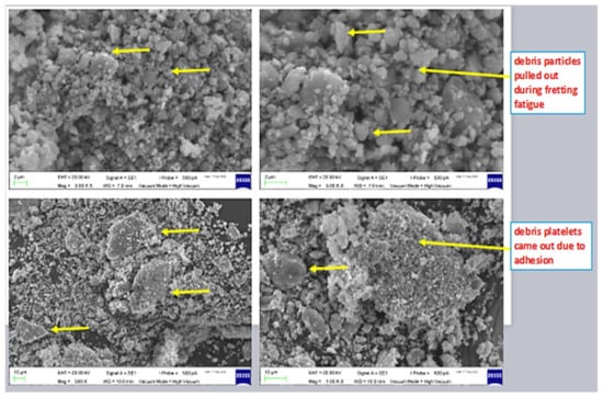 Secondly, the platelet-like debris are also observed in the imaging; platelets are mainly formed due to detachment during adhesion between the mating surfaces. With the increased temperature at the interface of mating asperities, the plastic flow takes place, which resembles the formation of platelet-like debris and the craters on the base alloy surface once these platelets detach entirely from the surface.