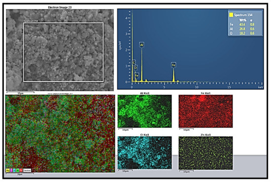 The wear debris of AA7075-T6, S-10, and S-24 AA7075-SiC/Gr Composite samples are analyzed using SEM imaging EDX and mapping elemental analysis. The wear debris images of base alloy AA7075-T6 are shown in Figure 21. Their EDX and mapping results are displayed in Figure 22. From the wear debris images, it is observed that there are mainly two shapes of particulates; one is fine spherical morphology particles which came out of the parent metal alloy during dry sliding wear because of fretting fatigue behavior. The surface cracking and nucleation around the hard precipitates result from the fretting fatigue repetitive loadings during dry sliding actions. Once the surface crack propagates, the inherent precipitates along with α-phase dendritic structures break down due to exposure to the surface repetitive loadings. These forms the fine particulate-shaped debris.