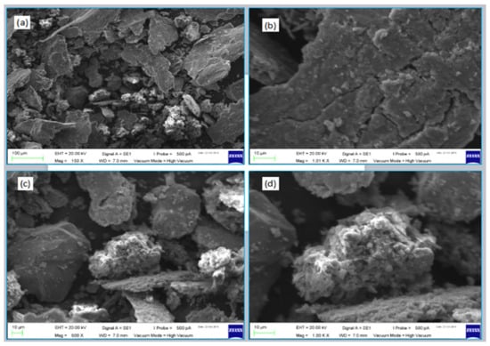SEM micrographs of wear debris of S-24 AA7075-SiC/Gr composite indicating (a,b) platelets (c,d) particles agglomerated as spheroids.