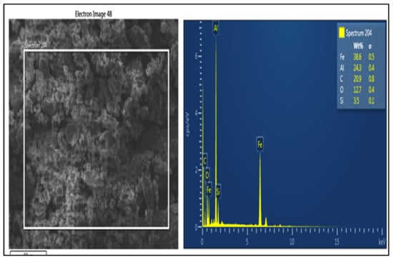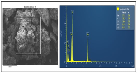 The findings of the S-10 wear sample debris analysis are represented in Figure 26, Figure 27 and Figure 28. The images of the wear debris generally depict small-sized particulates morphology and in combination with a few giant platelets. Here, in this case, the Fe content has increased in comparison to the last sample, i.e., 38.9%. The Al content is greater, and the Si and C percentages have significantly decreased. This indicates that the SiC and graphite particle pullout has not happened. Instead, the well-bonded graphitized SiC particles have acted as the load-bearing elements and have reduced the wear rate. The initial fatigue action has led to few platelet formations due to the combination of fatigue and delamination. However afterward, once the well-bonded graphitized-SiC particles have exposed and optimized their shapes as the active asperities, the wear rate has decreased significantly. The mechanically mixed layers of graphitized-SiC formed have continuously protected the pin sample area, and only fine debris particles due to abrasion are out. Thus, the large spheroids are not obtained; instead, the fine debris with small sizes is observed.