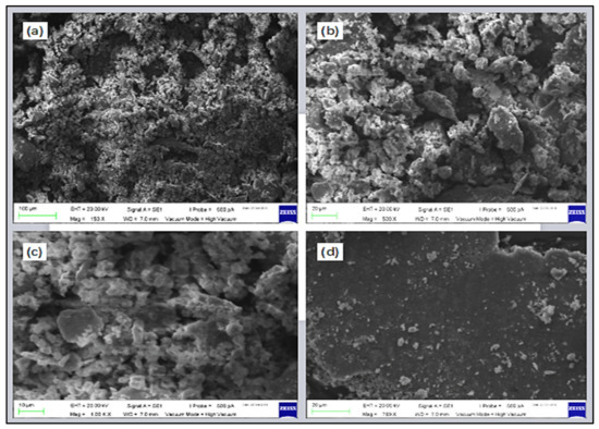 Figure 4 depicts the particle distribution within the composite’s stir zone after processing in the case of the S-24 composite. When compared to the S-10 composite, it has been shown that the particles are more densely distributed inside the aluminum matrix. The dense clusters of SiC/Gr particles have led to the porosity around the agglomerates, as shown in Figure 4b. The highly dense regions are observed in Figure 4a,c,d images. Here, in the S-24 composite, the tool rotational speed used is 500 rpm at 20 mm/min traverse for the volume percentage of 12% SiC/Gr. Thus, the extent of plastic deformation during the processing was not enough to give particles homogenous distribution within the matrix. The flow stress of the basic aluminum alloy must be greatly exceeded by the level of plasticization; only then would the dispersion have occurred more evenly. The high-volume percentage of SiC/Gr mixture was found to be difficult to disperse uniformly within the matrix band with lower stirring rotational speed.