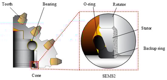 In recent years, deep strata have become important exploration and production areas of global oil and gas resources [,]. Roller cone bits are widely used in exploiting oil and natural gas due to their high specific pressure, high adaptability, and low wear [,]. In actual drilling work, bearing failure has been found to be one of the main reasons for damage to the roller cone bits []. The bearing sealing system faces severe challenges in complex hard formations, high temperature and pressure, and frequent vibration; thus, the operational reliability of the bearing sealing system is critical to the drilling efficiency, cost, and service life of the roller cone bits.