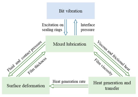 The interactions between the rotor, stator, liquid film on the end faces, and auxiliary seals all need to be considered in combination with fluid mechanics, solid mechanics, heat transfer, and dynamics. The thermal–fluid–solid–dynamic coupling relationship of SEMS2 is shown in Figure 2.