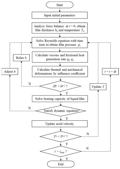 The finite difference method and the Newmark method were used in the calculation. First, the space domain and the time domain of SEMS2 were discretized. The coupling solution of Reynolds equations, dynamics equations, etc., were obtained by the multiple numerical iteration method. The thermal–fluid–solid–dynamic coupling calculation process is shown in Figure 5. In the innermost cycle, the parameters in Reynolds equation are iterated using the five-point difference method to determine the convergence of liquid film pressure. In the second cycle, the equilibrium film thickness affected by thermal deformations of rotor and stator is calculated using the influence factor method, and the film thickness relaxation iteration is carried out. In the third layer, the film thickness satisfying the dynamic equation is adjusted by the dichotomous method and the axial velocity is updated. The outermost layer is the time-item program loop which iterates to the end of a specific moment.