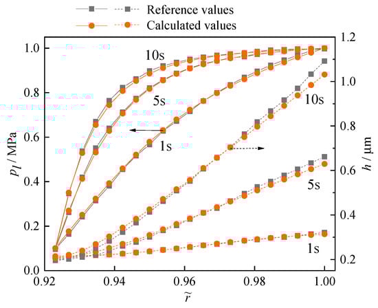 The steady-state results of metal seals obtained by simulation have been verified with the experimental results in the literature []. On this basis, the calculation results of the multi-field coupling model and method proposed in this study were compared with results from the literature [] to verify their accuracy. The parameters of the mechanical seals in the above literature were substituted into the numerical model of this study to solve the dynamic performance. The calculated values and reference values of the liquid film pressure (pl) and liquid film thickness (h) on the sealing end faces are compared at different times (t = 1 s, 5 s, and 10 s) in Figure 6. It can be seen that the radical changes in the liquid film pressure (pl) and film thickness (h) obtained by the model in this study are consistent with those obtained in the literature at three times, and their corresponding values are in good agreement with each other. The relative errors of the liquid film pressure (pl) and liquid film thickness (h) both reach their maximum values (7.78% for pl at t = 1 s and 7.79% for h at t = 10 s) near the inner diameter side (= r/ro = 0.93) of the sealing end faces. This may be because we considered the influence of the viscosity–temperature effect on the fluid medium in this study. Therefore, the comprehensive numerical model established in this study is suitable for predicting the multi-field coupling effect and dynamic characteristics of metal seals.
