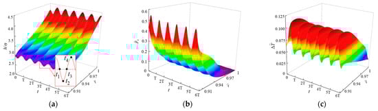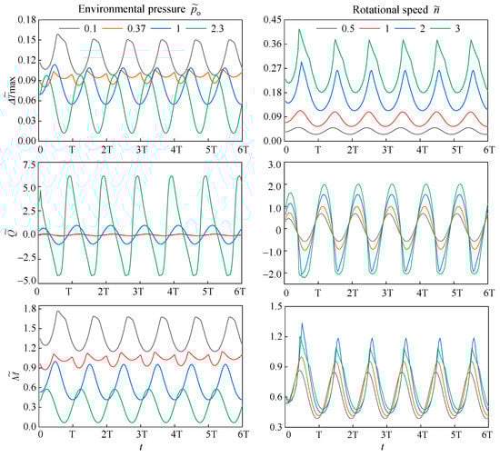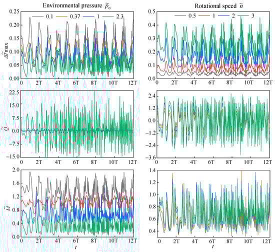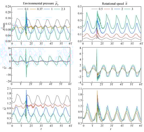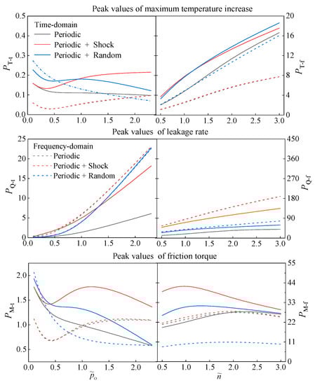 Due to the complexity of bottom hole drilling, the operation of the cone bits may be affected by instantaneous impacts. Here, we assume that the SEMS2 is subjected to a sudden load (Fs = 5 kN) at ts = 1.5T while periodically vibrating. Time-domain and frequency-domain changes in dimensionless maximum temperature increase (Δ), leakage rate (), and friction torque () with dimensionless environmental pressures (o) and rotational speeds () under periodic vibration and instantaneous shock are shown in Figure 12 and Figure 13, respectively.