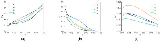 The three-dimensional distributions of the film thickness ratio (h/σ), dimensionless contact pressure (c = pc/poi), and interface temperature increase (Δ= ΔT/Toi) on the end faces of SEMS2 under periodic vibration are shown in Figure 7. The radial changes in liquid film thickness (h/σ), dimensionless contact pressure (c), and temperature increase (Δ) on the sealing end faces at the characteristic times (t1~t4) in Figure 7a are analyzed in Figure 8.