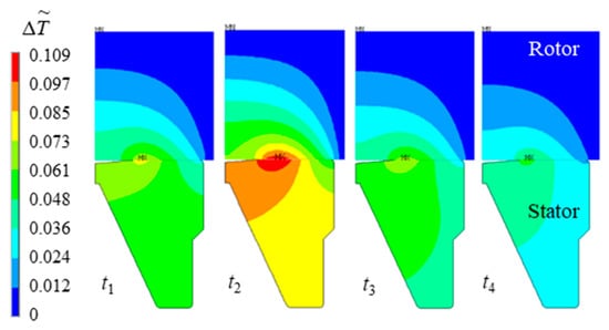 The interface temperature increase (Δ) on the end faces at each time increases first and then decreases with the radius (). The vibration amplitude of the maximum temperature increase (Δmax) near the ID (about = 0.91) reaches 2.8 times that of the minimum temperature increase (Δmin) on the OD under periodic vibration. Particularly at time t2, the maximum difference of the interface temperature increase (Δ) along the radial direction exceeds 63%. The temperature increase distribution of the sealing rings at different times is further analyzed in Figure 9. Affected by the heat transfer on the end faces, the temperature increase (Δ) of the rotor and stator gradually decreases from the ID of the end faces outward. The end faces near the ID side bear most of the contact pressure, and frictional heat is gradually generated due to the contact of the micro-asperities between the end faces. On the other hand, the heat exchange capacity of the OD side of the rotor and stator gradually enhances. The changing gradient of the temperature is particularly obvious for the rotor, causing the overall temperature increase of the rotor to be lower than that of the stator. This makes the thermal deformation of the end face of the stator larger than that of the end face of the rotor.