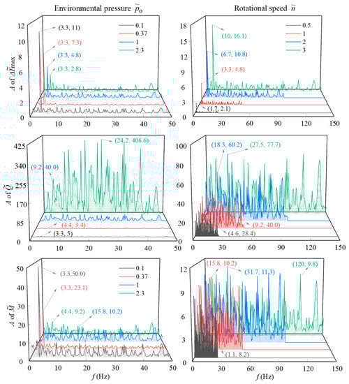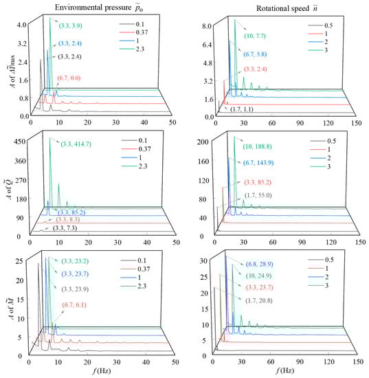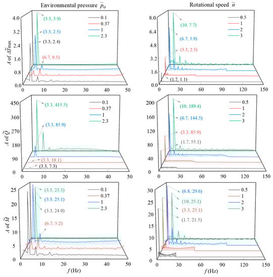 The amplitude spectra under the initial conditions reveal that the pulsations of the maximum temperature increase (Δ), leakage rate (), and friction torque () decrease periodically, mainly in the low-frequency range of 0~50 Hz. These vibration amplitudes are generated at an integer multiple of the rotation frequency (fn = n/60) of the drill bits. The corresponding frequency is fi = kfn, where k is a positive integer. Except for the environmental pressure o = 0.37, the dominant frequency of these three performance parameters is the rotation frequency, and the corresponding amplitudes increase with the environmental pressure. As the rotational speed () increases from 0.5 to 3, the range of these fluctuation frequencies increases proportionally, and the dominant frequency amplitudes of the maximum temperature increase (Δ), leakage rate (), and friction torque () increase by 6 times, 2.4 times, and 20%, respectively.