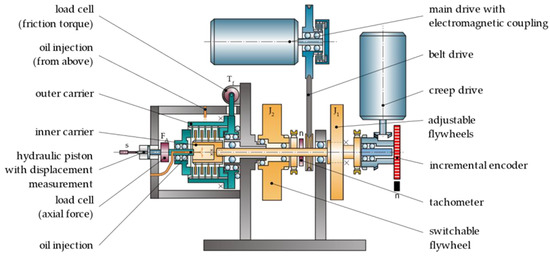 The experimental investigations are carried out on a wet brake component test rig ZF/FZG KLP-260. The description of the test rig is according to [26,32]. The test rig operates in brake mode with a fixed outer carrier and rotating inner carrier, as pictured in Figure 1.