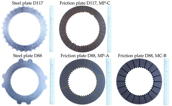 For the experimental studies, we use steel (outer) and friction (inner) plates from the serial production of automotive applications with organic friction linings (paper MP/carbon MC). Three tribological systems are investigated. We vary the clutch size, characterized by the mean diameter of the clutches (88/117 mm), friction lining material (MP-A/MP-C/MC-B) and lubricant (L-103/L-201/L-205). All friction plates have a multi-segmented groove pattern. One clutch package consists of five steel plates and four friction plates. Thus, there are eight friction interfaces (z = 8). The nominal clearance between each friction plate and steel plate is 0.20 mm. Figure 2 pictures the steel and friction plates.