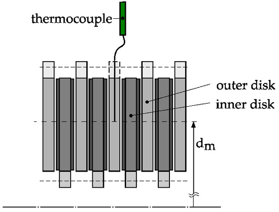We measure mass temperatures in the center steel plate at several evenly spaced circumferential positions with thermocouples (NiCrNi Type K Class 1, Ø 0.25/0.5 mm, response time approximately 10/30 ms calculated according to [35], as sketched in Figure 3. Therefore, we apply a high-density polysynthetic silver thermal compound to the thermocouples and place them in a circumferential drill hole (Ø 0.3/0.6 mm) approximately down to the mean diameter (dm) positioned in the midplane of the respective steel plate. To determine the mass temperature of the steel plate, the signals of the thermocouples distributed around the circumference are averaged.