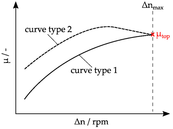 The measured value is µtop which represents the value of the CoF at maximum differential speed. Figure 5 shows an explanation for the measured value for two types of friction characteristics (course of CoF over sliding velocity) leading to equivalent values of µtop. We evaluate µtop of the last slip phase of each slip cycle. We use the mean average of µtop from the last five slip cycles of each load stage as an input parameter for our linear friction models. The values µtop are used as output values for the model.