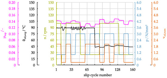 Figure 6 shows the measurement of the varied factors (oil injection temperature, nominal feeding oil flow rate, clutch pressure, maximum differential speed) and the measured variable (µtop) of each slip cycle of system D117/MP-C during the first run of the full-factorial test. Each block consists of 160 data samples, respectively slip cycles.