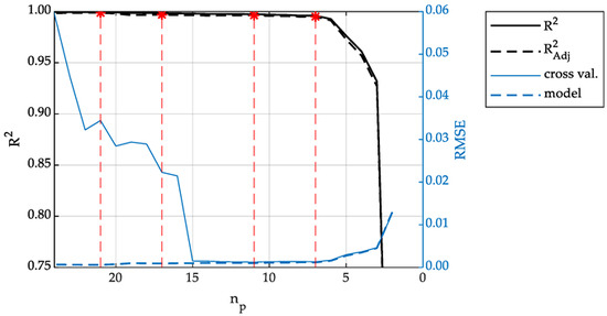 Local maxima in are marked in red and can be seen as suitable models with high efficiency due to a good ratio of model quality and number of parameters. If no clear maximum can be found, a sudden drop off in both coefficients can also mark interesting models. Here, the remaining parameters contribute more to the quality of the model, than the ones just removed.