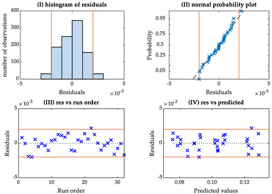 After finding a suitable model, its residuals are analyzed to validate three statistical prerequisites. Figure 8 is a representative example depiction of the residual plots used for validation. Orange lines indicate measurement uncertainty of the test rig for CoF. Histogram (I) is supposed to resemble a bell curve. Residuals in the normal probability plot (II) should follow a diagonal. Additionally, if there are no apparent deviations to the right or left, these plots indicate normally distributed residuals. The residuals in the run order plot (III) should be evenly distributed around the x-axis, which implies the independence of the model errors. The last graph (IV) plots the residuals against the predicted values. An even distribution without any patterns indicates that the residuals have the same variance across all factor settings. Therefore, all necessary statistical prerequisites are fulfilled.