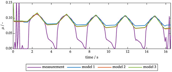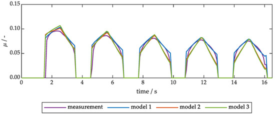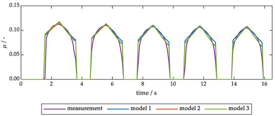 The load stage LS1 in Figure 11 has higher pressure (3 N/mm²) compared to LS3, while the other factors stay the same. Higher pressure causes a faster rise in steel plate temperatures. Conversely, the CoF decreases over the slip phases. This behavior is well reproduced by all three models. In this high-pressure scenario, model 1 is closer to the measurement for the low-speed areas of the later slip phases. In the low-pressure scenario, models 2 and 3 performs better in these areas. Both plots show linear behavior of the models, which cannot perfectly match the non-linear behavior of the measured CoF.