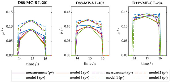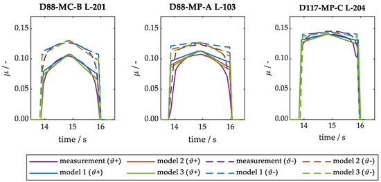 To compare transferability of the models between all tribological systems, only the last slip phases are observed. Figure 12 shows the influence of clutch pressure on CoF with the dotted lines representing 1 N/mm² (p−) and the solid lines representing 3 N/mm² (p+). Although each model was derived for one specific friction system, all models react to the change in clutch pressure for all friction systems and can reproduce the level of CoF. Considering the behavior of CoF, the models perform differently in specific areas. In particular, the non-linear and asymmetric behavior of D117-MP-C L-204, caused by strong temperature dependence of CoF, is not reproduced by the linear models. Here, friction system D88-MP-A L-103 is used for validation only.