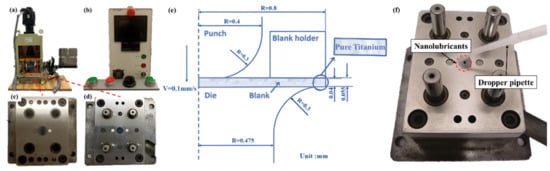 In this study, a desktop servo-press machine DT-3AW (Keyence Corporation, Osaka, Japan) was used for MDD process. As shown in Figure 2, the MDD system contains press machine, die sets and control box. The die sets consist of the upper and lower dies where the punch and cavity are placed. The press machine provides the load, and the control box is used to set the operation of the press machine and obtain the position of punch during the process. The real-time drawing force is recorded by a load cell which is located on the top of the upper die. In this study, the MDD process includes two stages: blanking and drawing. In the blanking stage, a round blank with the radius of 0.8 mm was cut from the pure titanium foils, and subsequently the round blank was drawn with a velocity of 0.1 mm/s. The geometrical dimensions of the MDD system are shown in Figure 2e. The friction between the blank and the lower die dominates the total friction force and ultimately affects the drawing force. Therefore, two drops (approx. 0.1 mL) of the water-based TiO2 nanolubricants were dripped into the cavity of the lower die before the MDD process, as shown in Figure 2f. The MDD process was repeated five times for each test to minimise the data scattering of the drawing force.