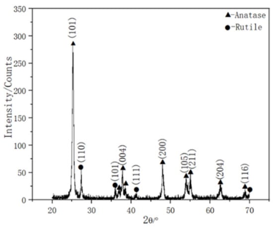 The XRD pattern of the P25 TiO2 NPs is shown in Figure 3. The phase of the particles can be identified as typical P25 TiO2 with 75% of anatase and 25% of rutile based on the XRD standard atlas.