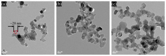 TEM images of P25 TiO2 NPs with different concentrations of water-based nanolubricants: (a) 0.5 wt%, (b) 1.0 wt%, and (c) 2.0 wt%.