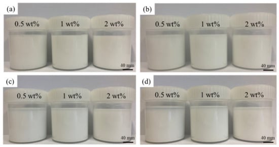 P25 TiO2 NPs dispersed in different water-based nanolubricants at time of (a) 0 h, (b) 24 h, (c) 48 h, and (d) 72 h.