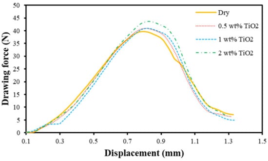 The displacement and drawing force curves obtained under various lubrication conditions.