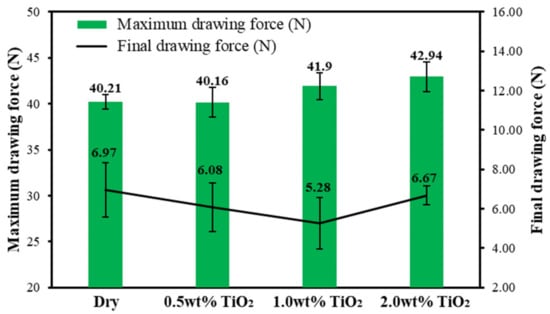 The maximum drawing force and the final drawing force for each group were summarised in Figure 7. As analysed previous, there is an insignificant change in the peak drawing force as the drawing force is dominated by the resistance of bending before a full cup shape is formed. The effect of the 0.5% and 1.0% nanolubricants on maximum drawing force is insignificant. For the 2.0% nanolubricant, the peak drawing force (42.94 N) increases slightly as the TiO2 NPs agglomeration impedes the material flow. It is evident that the highest final drawing force value (6.97 N) is found in the dry condition among all the lubrication conditions. For the final drawing force, the lubrication effect of the 0.5% and 1.0% nanolubricants is obvious, which achieves reductions of 12.7% and 24.2%, respectively, compared with that in dry condition. In addition, the final drawing force experiences a relatively lower drop to 6.67 N when the 2.0 wt% nanolubricant is employed.