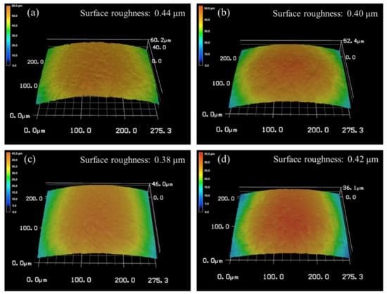 The surface roughness is an important parameter to evaluate the forming quality of the micro cups. Figure 8 shows the 3D surface morphology of the micro cups from different lubrication conditions. As can be seen in Figure 8a, considerable bumps are observable on the cup surface without the use of nanolubricants and the measured surface is the roughest among four groups. For Groups 2, 3 and 4, the surface quality of the micro cups has been improved from the observation of Figure 8b–d. It is worth noting that the micro cups from Group 3 have the smoothest surface, which displays the least surface peaks and valleys. In addition, the surface quality of the micro cup from Group 4 shows a slight improvement compared with that from dry conditions, but not as evident as those from Groups 2 and 3. Based on the 3D surface morphology, the surface roughness values of the micro cups from four groups were summarised in Figure 9. For MDD process, the nanolubricant with 1.0 wt% TiO2 NPs shows the best lubrication capability in achieving a good surface quality by reducing the surface roughness value of 12.55% compared with that obtained under dry condition.