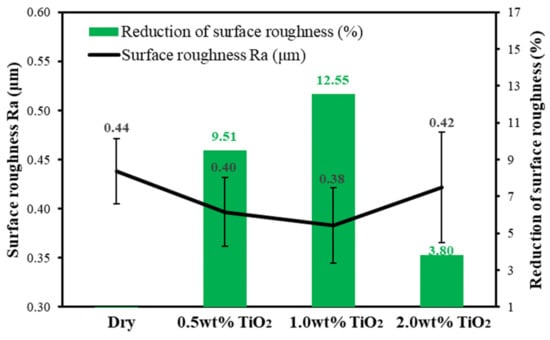 Following the trend of sustainable development, water-based lubricants with nanoparticles (NPs) are becoming an alternative to traditional lubrication methods [,,]. He et al. [] systematically studied the lubrication performance of nanolubricants with various concentrations of Al2O3 NPs. Compared with the other conditions, the Al2O3 nanolubricant could decrease the friction by 27% through the shaping of thin films and mending effect. Wu et al. [,,,,] studied the tribological behaviour of TiO2 nanolubricant using ball-on-disk tribometer and found that the ball wear was decreased by 97.8% compared to that under dry condition. They subsequently applied water-based TiO2 nanolubricant in hot steel rolling with different concentrations of TiO2 and different formulas. The results showed the nanolubricant can effectively reduce the rolling force, surface roughness, oxide scale thickness of the rolled steel. Its surface finish can be also improved due to the rolling and mending effects of the TiO2 NPs on the surface of materials. In MDD, Kamali et al. [] applied oil-based TiO2 nanolubricant in the MDD experiments with magnesium alloy, and it was found that 2.0 wt% nanolubricant showed the best lubrication performance by obtaining the lowest drawing force and best surface quality. Nevertheless, oil-based lubricants usually contain a high concentration of oil. After the use of oil-based lubricants, cleaning and disposal of the used lubricants is an unavoidable issue due to the non-biodegradable nature of oil [,]. To improve the lubrication performance of lubricants but reduce the usage of oil, the novel water-based TiO2 nanolubricants were developed in this study.