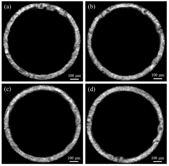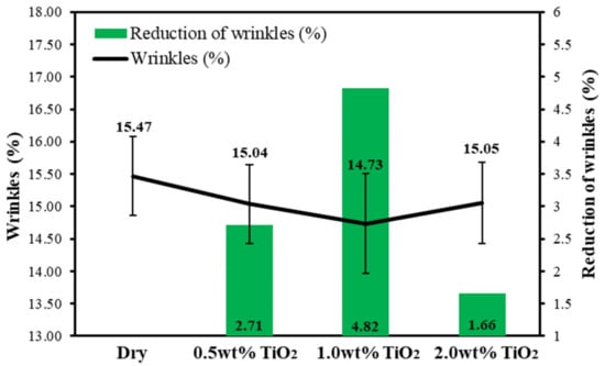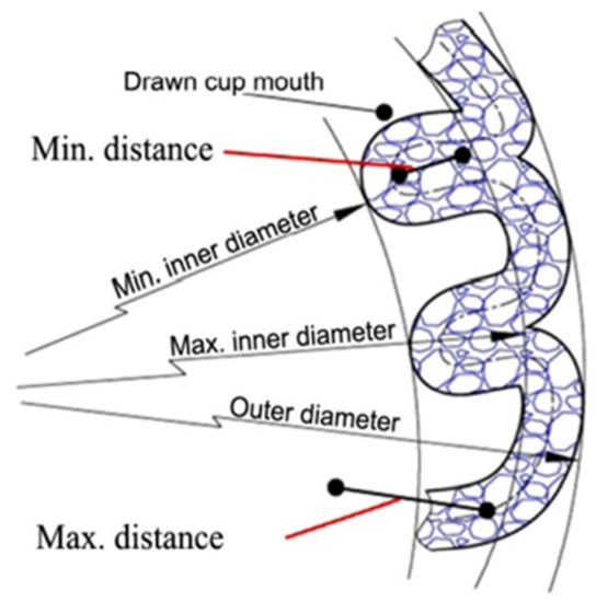 Wrinkling is an important feature to evaluate the forming quality of the micro cups. Less wrinkles mean better forming quality and higher shape accuracy. During the MDD process, the blank undergoes large radial drawing stress and tangential compressive stress []. The surface roughness affects the metal flow behaviour, thereby affecting the forming performance []. A large surface roughness will cause the difficulty in material flow and induce more winkles []. To clearly exhibit the reduction of wrinkles, the difference between the outer diameter and the minimum inner diameter of the micro cups is defined as the maximum distance, and the difference between the outer and maximum inner diameters of the micro cups is defined as the minimum distance [], as shown in Figure 10. The amount of wrinkle is calculated by dividing the difference between the maximum and minimum distances by the maximum distance. Figure 11 shows the top views of the micro cups under various lubrication conditions. It can be seen that obvious wrinkling occurs on the flange of the micro cup under dry condition, as shown in Figure 11a. The number of wrinkles is significantly reduced with the use of nanolubricant, especially for the cup from Group 3 (Figure 11c), from which the winkles are hardly seen on the edge of parts. The wrinkles of micro cups obtained using various nanolubricants are summarised in Figure 12. The wrinkles decreased from 15.47% to 14.73% when the 1.0 wt% TiO2 nanolubricant was used, showing an improvement of 4.82%.