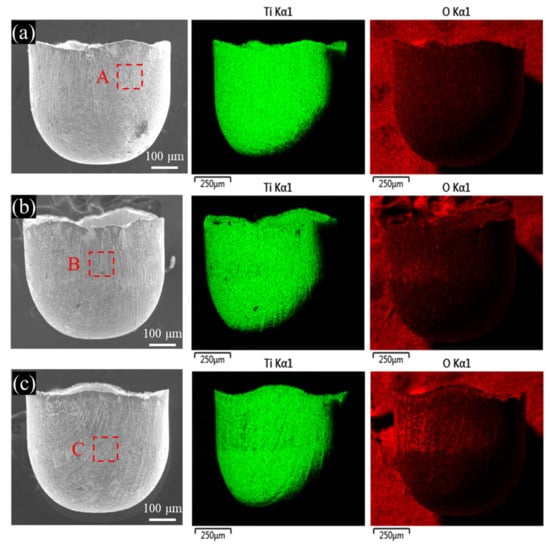 Figure 13 shows the SEM images and EDS mappings of the side view of the drawn cups under different lubrication conditions. Since both titanium foil and TiO2 NPs contain the element of titanium, the distribution of TiO2 NPs could be determined by the distribution of oxygen element. When the 0.5 wt% nanolubricant is applied, the distribution of TiO2 NPs on the micro cup is observable but not as noticeable as that indicated under other lubrication conditions. As the concentration of nanolubricant increases from 0.5 to 2.0 wt%, there is a significant increase in the number of TiO2 NPs on the surface of the drawn cups according to the EDS mappings. In order to investigate the lubrication mechanism of the TiO2 NPs on the micro cups surface, three areas on the micro cup wall were selected from each micro cup and marked as Areas A, B and C.