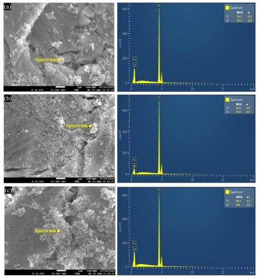 SEM images with higher magnification and EDS spectrum (×10,000) of the Areas A, B and C were selected to explore the lubrication mechanism of TiO2 NPs in MDD process, as shown in Figure 14. The distribution of TiO2 NPs on the surface and the agglomeration in the roughness valleys can be clearly observed according to the SEM images. The corresponding EDS spectrums of the TiO2 NPs were also detected and exhibited along with the SEM observation. As can be seen from Area A (Figure 14a), a few TiO2 NPs are distributed but not fully covered on the surface, especially in the CLPs area, which could result in the incomplete mending effect in this region. A portion of dispersed TiO2 NPs on the contact area can be used to bear the load by converting the sliding friction to the rolling friction, which reduces the rubbing between the tool and the workpiece. This phenomenon is called the rolling effect. As for the Area B shown in Figure 14b, the TiO2 NPs are evenly dispersed on the surface of the micro cup and the CLPs region are well filled with TiO2 NPs. This greatly enhances the synergism action of the rolling and mending effects, and further reduces the friction between the blank and the lower die. However, compared to the 0.5 and 1.0 wt% nanolubricants, excessive TiO2 NPs are provided to fill the CLPs region when the 2.0 wt% nanolubricant is applied, and the redundant TiO2 NPs are agglomerated on the surface of the material, as presented in Area C (Figure 14c). The agglomeration impedes the material flow during the MDD process and affects the further supply of the TiO2 NPs into the contact area, which results in a relatively poor lubrication performance.