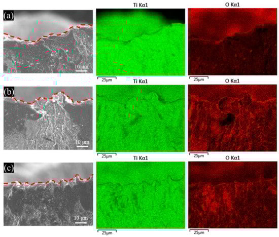 SEM images and EDS mappings of side view of the drawn cups using different lubricants: (a) 0.5 wt% TiO2, (b) 1.0 wt% TiO2, and (c) 2.0 wt% TiO2.