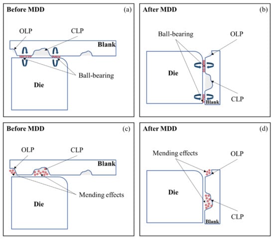 Figure 16 illustrates the lubrication mechanism of water-based TiO2 nanolubricants in the MDD process. The nanolubricants with excellent dispersion stability provide the necessary prerequisites for obtaining excellent lubrication performance between the blank and the lower die. Some TiO2 NPs worked as ball bearings to reduce the friction of real contact areas between the blank and the lower die. These TiO2 NPs rotate in the contact area during the MDD process, which results in a lower coefficient of friction than that obtained under dry conditions where the two surfaces slide directly against each other, as shown in Figure 16a,b. In addition, TiO2 NPs aggregate in the CLPs area, and thus the pits and valleys on the cup surface can be compensated by the mending effect of TiO2 NPs, resulting in a relatively lower surface roughness, as shown in Figure 16c,d. In this study, as the concentration of TiO2 NPs increases from 0.5 to 1.0 wt%, more TiO2 NPs effectively participate in the MDD process in the contact area and CLPs areas, which enables the lubrication performance to gradually improve. However, further increasing the TiO2 NPs concentration to 2.0 wt% will cause excessive aggregation of TiO2 NPs, which leads to the increase in friction and decrease in forming quality. At the mouth area of the drawn cups, the TiO2 NPs can be kept in the OLPs area due to high viscosity of the nanolubricant. Hence, the remained nanolubricant could provide load bearing capacity and therefore result in a reduction in friction. In addition, the aggregation of the appropriate concentration of TiO2 NPs can reduce the shear stress in the contact area during MDD process, which also results in the reduction of friction on the material surface [].