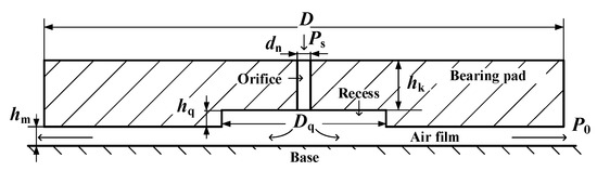 As shown in Figure 1, the main structure of the aerostatic bearing is a bearing pad, an orifice, a recess, and an air film. The airflow enters the recess through the orifice and then spreads around to form a high-pressure air film. The high-pressure air film can support the bearing load [20,21,22]. The diameter of the aerostatic bearing is D = 80 mm, the diameter of the recess is Dq = 5 mm, the height of the recess is hq = 0.1 mm, the height of the orifice is hk = 0.3 mm, the diameter of the orifice is dn, the thickness of air film is hm = 15 μm, the inlet pressure is Ps = 0.5 MPa, and the outlet pressure is P0 = 0.1 MPa.