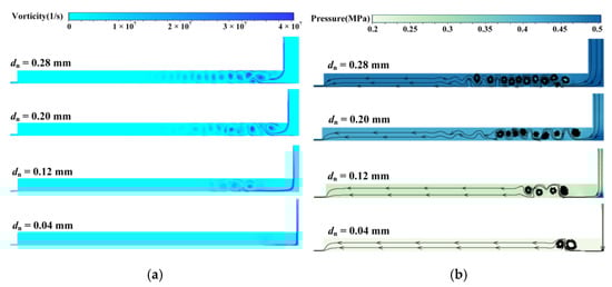 Figure 2 shows the vorticity cloud diagram, pressure cloud diagram, and streamlines for the aerostatic bearing with different orifice diameters by LES (orifice diameter is dn = 0.28/0.2/0.12/0.04 mm). Figure 2a shows that a series of turbulent vortices are formed after the high-pressure air flows into the recess, and the turbulent complexity and vorticity decrease with decreasing orifice diameter. From the pressure distribution in Figure 2b, it can be seen that there is a low-pressure region at the center of the turbulent vortex, and the pressure distribution in the recess gradually decreases with decreasing orifice diameter. As seen in Figure 2b, the flow is deflected after entering the recess from the orifice, and the deflection angle decreases as the diameter of the orifice decreases.