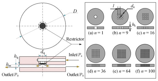 From the above analysis, it can be seen that reducing the orifice diameter suppresses the formation of turbulent vortices. It also reduces the pressure distribution in the recess, which leads to a decrease in the load capacity. If the orifice diameter can be reduced and the load capacity of the aerostatic bearing can be guaranteed, the flow field state of the aerostatic bearing can be improved, and its stability can be enhanced. Based on the above ideas, this paper designs an aerostatic bearing with a SMAR by keeping the total restriction area constant. The SMAR replaces the traditional single orifice with a square array of micro-holes (total restriction area is S = 2π(dn/2)2 mm2) to increase the number of holes and reduce the diameter of individual holes. The structure of the aerostatic bearing with a SMAR is shown in Figure 3, and the structural and operating parameters are shown in Table 1.