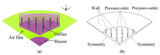 Figure 4b shows the boundary conditions of the aerostatic bearing, the inlet pressure is Ps, and the outlet pressure P0 is set as the ambient pressure. The left and right sections of the model are set as symmetric, and the rest of the boundaries are set as a wall. The gas inside the aerostatic bearing is assumed to be the ideal air.