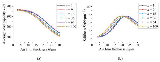 The static performance of aerostatic bearings with different number of micro-holes: (a) Average load capacity curves; (b) Stiffness variation curves.