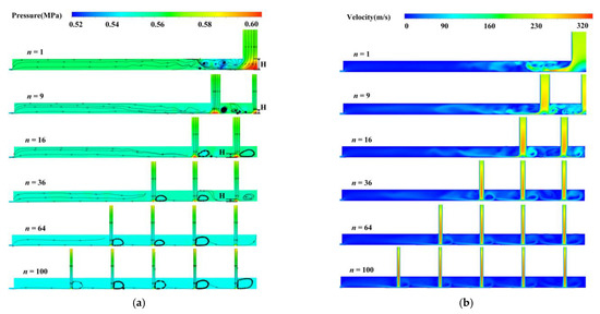 2D flow structures in the recess of aerostatic bearing with different number of micro-holes: (a) Pressure cloud diagram and streamlines; (b) Velocity cloud diagram.