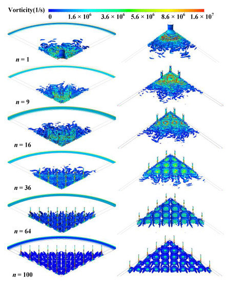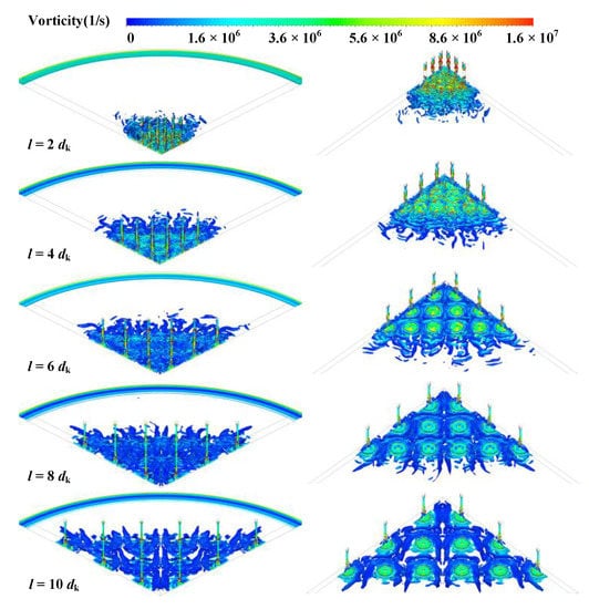 Figure 13 shows the iso-surfaces of vorticity of the aerostatic bearing (the number of micro-holes is n = 36) with different spacing of micro-holes. In the 3D flow field, the details of the airflow interactions between all adjacent holes can be easily captured. As can be seen from Figure 13, as the spacing of micro-holes increases, the complexity and vorticity of turbulent vortices gradually decrease, especially among adjacent orifices. The vortex structure in the recess also develops in the direction of order and stability.