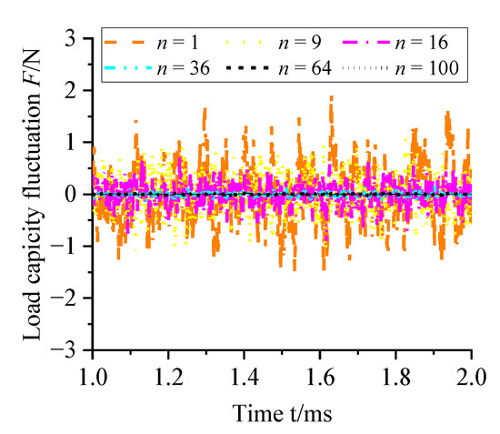 To quantitatively analyze the suppressing effect of the SMAR on turbulent vortices, the variation of the load capacity fluctuation of aerostatic bearings with time is shown in Figure 9. It can be seen that with the increase in the number of micro-holes, the amplitude of load capacity fluctuation decreases. The corresponding standard deviation is shown in Figure 10. It can be seen that the standard deviation of the load capacity fluctuation will decline rapidly with the number of micro-holes from 1 to 36 and remains stable from 36 to 100. It can be concluded that increasing the number of micro-holes can suppress the micro-vibration of the aerostatic bearing and improves its stability.