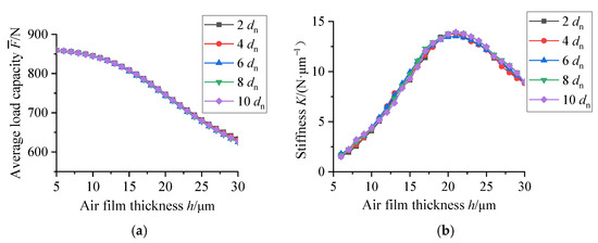 Figure 11 shows the average load capacity and stiffness of the aerostatic bearing (the number of micro-holes is n = 36) with different spacing of micro-holes. It can be seen that the average load capacity and stiffness of the aerostatic bearing with different spacing of micro-holes are consistent, which indicates that changing the spacing of micro-holes basically does not affect the static performance of the aerostatic bearing.