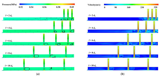2D flow structures in the recess of aerostatic bearing with different spacing of micro-holes: (a) Pressure cloud diagram and streamlines; (b) Velocity cloud diagram.